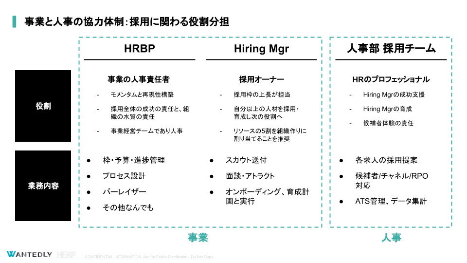 ーーラクスル様の特徴としては、HRBP、Hiring Manager、人事部採用チームという3本の柱を立てて、その役割をきちんと定義して機能させていることだと思います。まずそれぞれぞれの役割、概要を教えていただけますか?