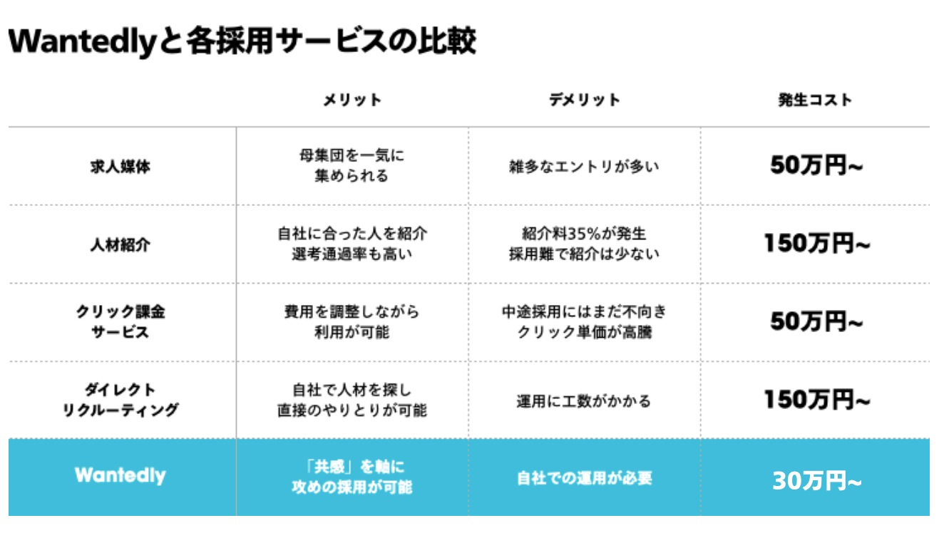 Wantedlyは成果報酬なし、月額約5万円から利用できるため、他採用サービスに比べて圧倒的に低いコストで共感度の高い人材を採用することができます。