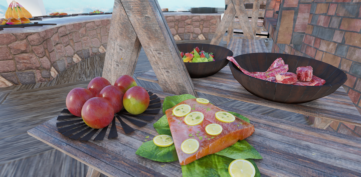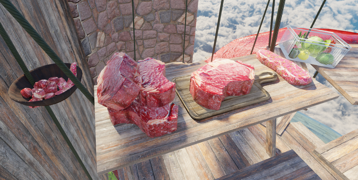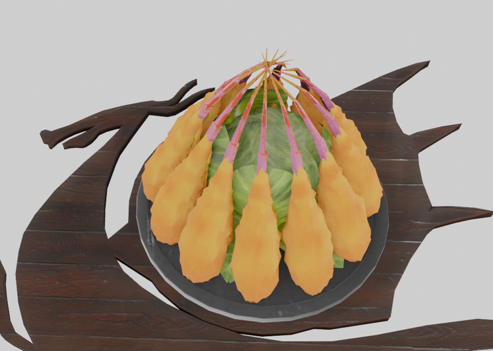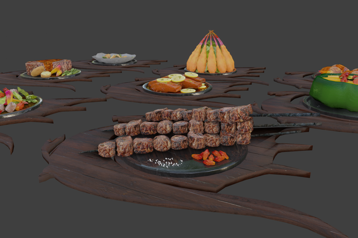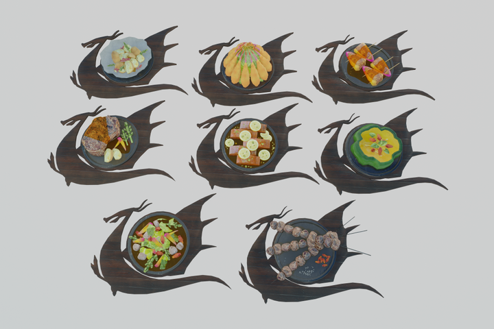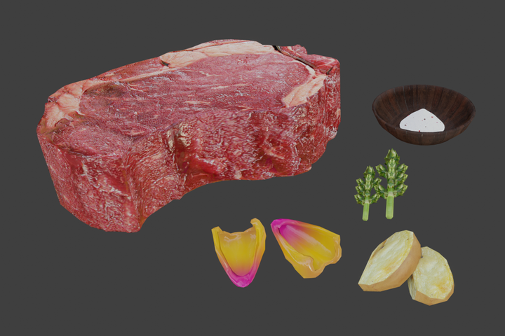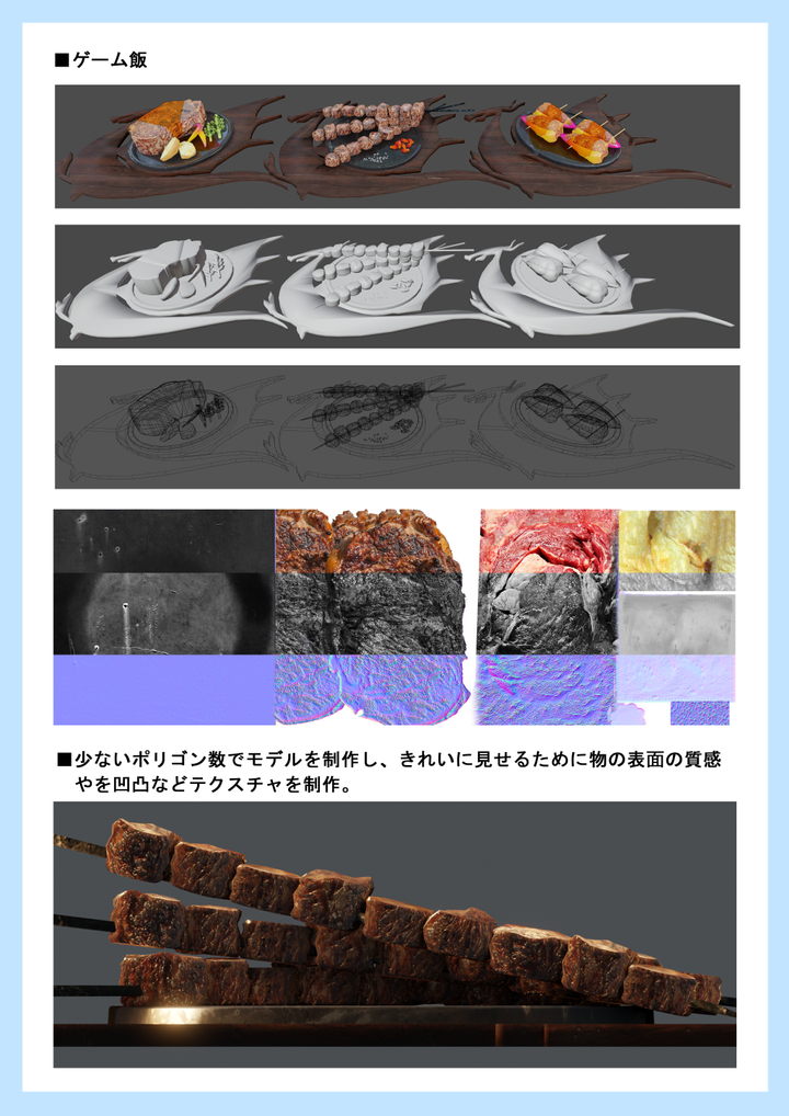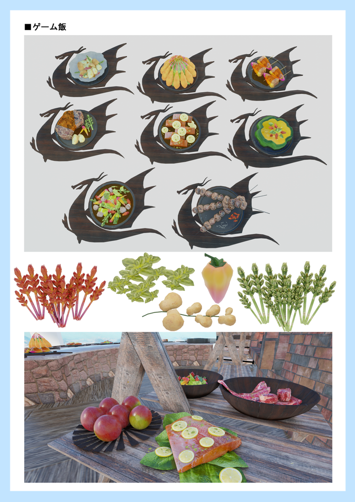使用ソフト・Blender 制作時間:2日 料理ゲーム用オブジェクト。 モンスターの肉やゲーム世界の野菜などをイメージして制作しました。 少ないポリゴン数でモデルを制作し、きれいに見せるために物の表⾯の質感 やを凹凸などテクスチャを制作しました。