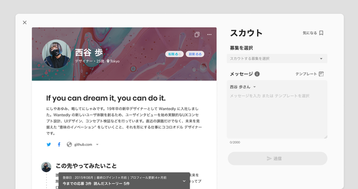 プロフィールのデザイン刷新に伴い、管理画面側のユーザプロフィールの情報構造や見え方が大きく異ってしまっていた問題をメインに解決しました。ユーザが書いた情報をそのまま伝えられることと採用担当者が素早く候補者を判断するための簡略化の実現に挑戦しました。 また、カスタマーサクセスのメンバーと協力し、採用担当の方にユーザテストを行えたことで問題を潰しながらのデザイン改善まで行うことができました。 Figma の Interactive Component を用いたプロトタイプを作成したことでマイクロインタラクションまでこだわることができ、且つエンジニアとのコミュニケーションが円滑に行えたと思っています。