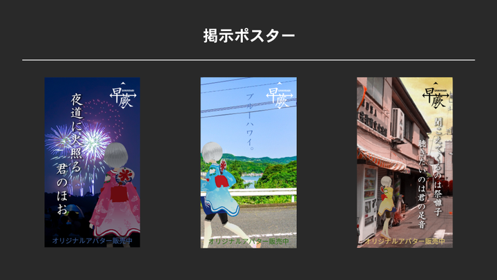 【使用技術】 Vroid Studio / Blender / Unity / Photoshop 2021年8月6日~9日に開催された「cluster アバターマーケット2021 夏のデジタル文化祭」にて、オリジナルアバター「はなび」を出展しました。バーチャル空間の中でコミュニケーションを取りながらアバターを販売する貴重な機会で、通常のネットショップとは全く違った販売体験をすることができました。