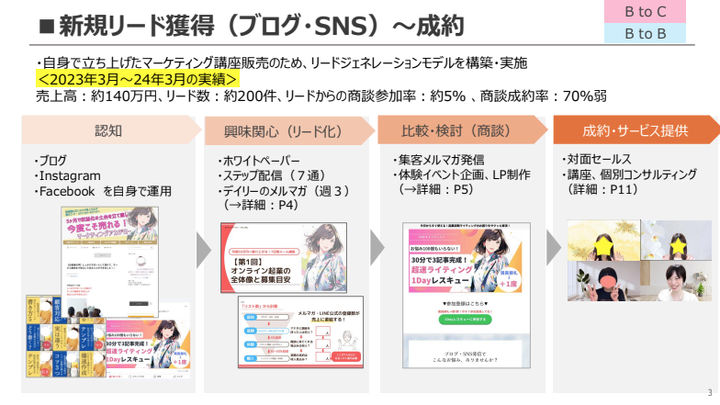 スモールビジネスを立ち上げようとしている40代〜50代女性を対象にマーケティング講座と個別コンサルを実施。主婦、元看護師、元保育士、元公務員、元グランドスタッフなどマーケティング未経験の方がお客様。広告は使わず、コンテンツマーケティングを軸に集客サポート。
