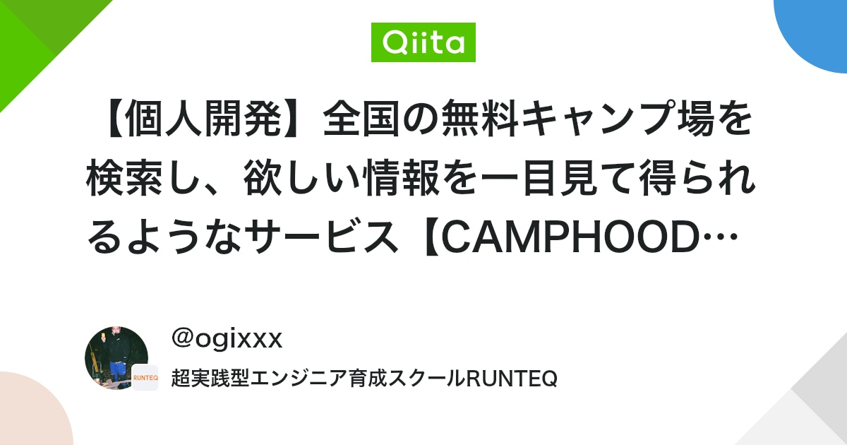 株式会社スタートアップテクノロジーが運営しているプログラミングスクール「RUNTEQ」にてRuby on Railsを学習致しました。個人開発では無料キャンプ場を利用しようとしている方に向けて、キャンプ場へ行くまでに欲しい情報を一目見て得られるような 情報収集の煩わしさを解消するサービス「CAMPHOOD」を開発しました。