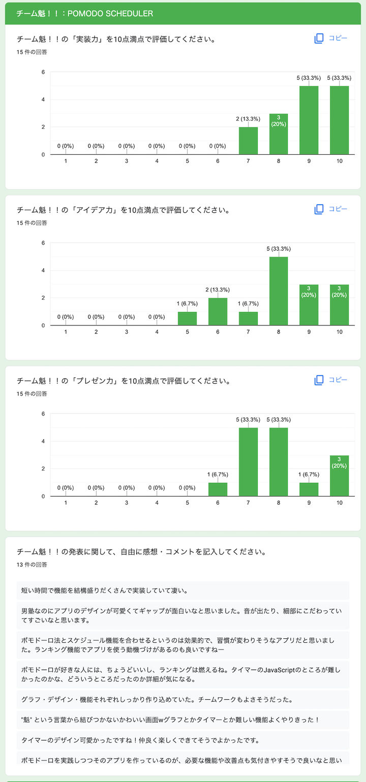 現役のエンジニアの方々に実装力を高く評価していただけました。 2週間という短い期間で多くの機能を実装できたのは ・ワイヤーフレームを作成し、チーム全員が作るもののイメージを統一 ・毎日ミーティングをして、アプリの機能や作り方を修正 ・Notionでタスク管理 ・チーム全員が任されたタスクをやりきった からだと思います! 私個人がチームのために行ったことを以下に記載しておきます。 【アプリ開発で担当した機能】 - 認証機能 - 使った時間を可視化するページ - ランキングページ - フォロワーのタスク時間を表示する機能 【チームのために行ったこと】 リーダーとして、チーム開発の仕組み作りを継続的に提案しました。 また、コミュニケーションを積極的取ることで、開発を円滑に進めました。 - 開発するアプリの提案 - Cacooというアプリでワイヤーフレームの作成 - 完成後のアプリのイメージをメンバー間で統一 - Notionを活用したタスク管理表の作成 - 実装したい機能の一覧を作成 - 大まかな役割を決める - Board viewという機能を使って、今日の進捗を可視化 - 各々が任された機能を細かいタスクに分解し、 - これから取り組むタスクを To-do - 作業中のタスクを In Progress - 終わったタスクを Complete に配置 - 振り返りの方法の改善 - 毎日の振り返りをNotionにまとめることを提案 - 前日の振り返りを簡単に見返すことができる - 個人→チームの順番で振り返りを行うように提案 - 個人振り返りを先に行うことで、チームの改善点を思い浮かびやすくなった - 個人振り返りで今日やったこと、明日やることを記載するように提案 - チーム振り返り時に、今日やったこと、明日やることを共有することで、タスクがどのくらい進んでいるのか把握できる - Githubの使い方を調べて共有