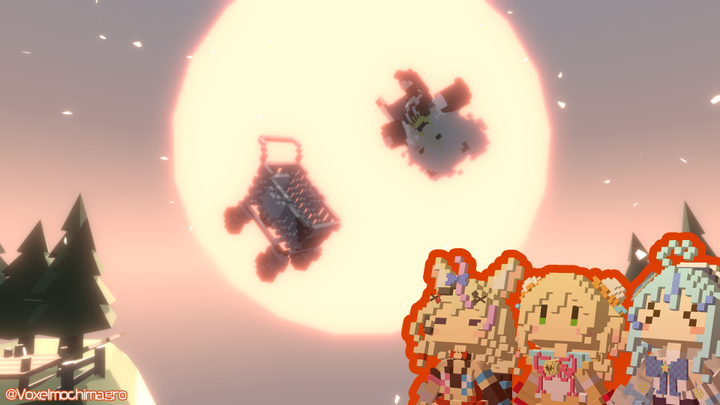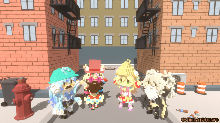 自作ボクセルキャラクターモデルをUnity上に持ち込み、VeryAnimationを用いたキャラクターモデルのポージング(アニメーション)作成、Postprosessのカメラエフェクト設定などを行い、魅力のある一枚作品を作成しています。 また、画像合成・編集ではPhotoshopを用いることがあります。