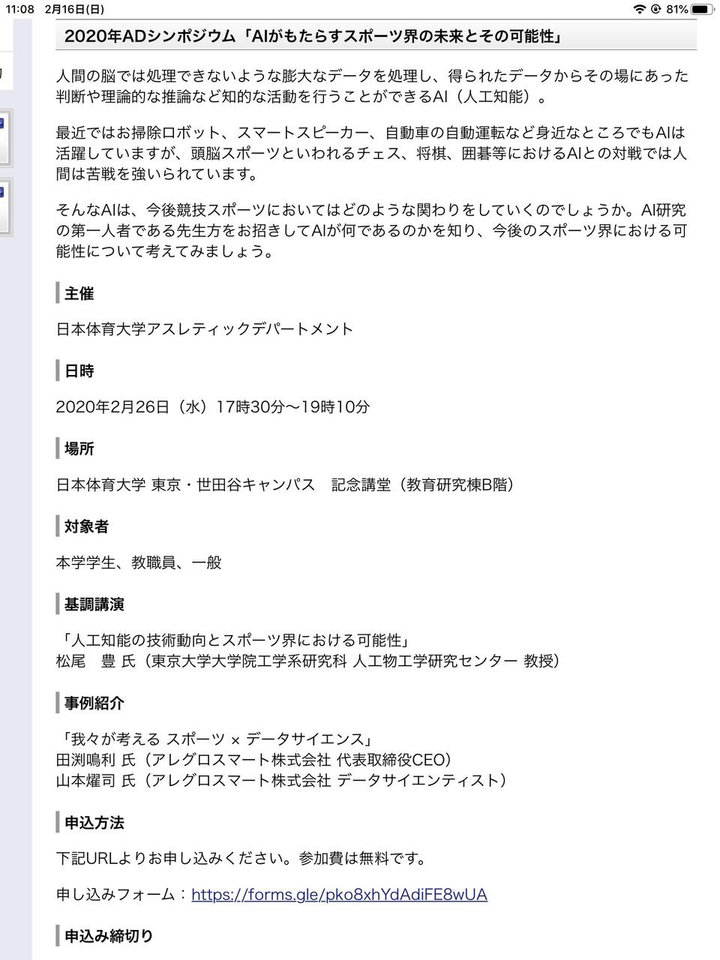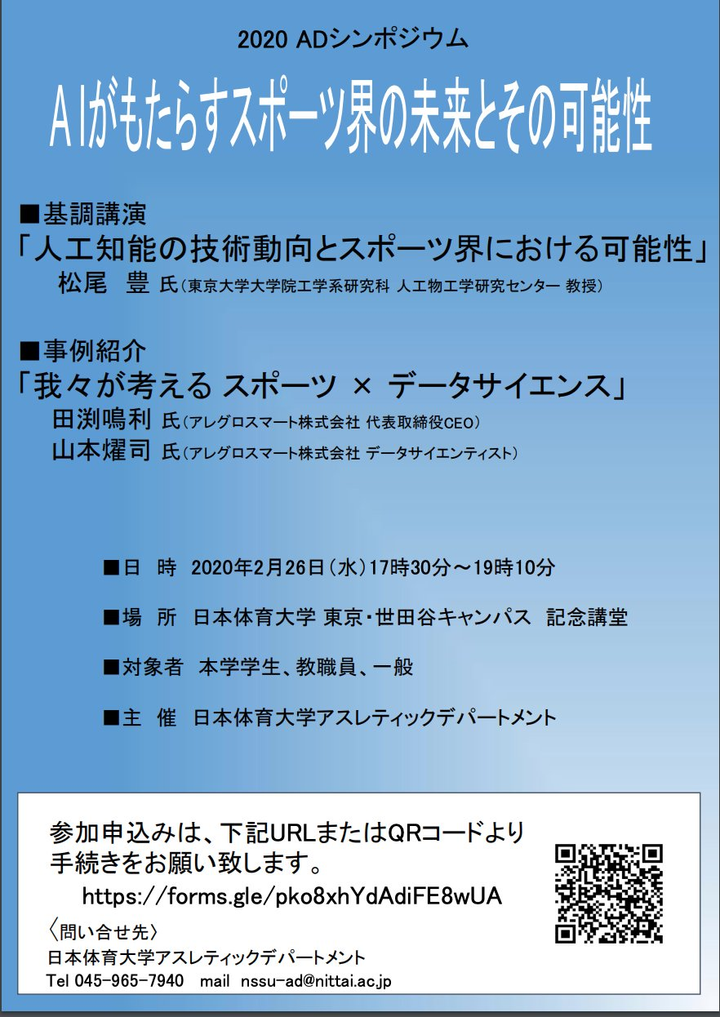 2月26日に日本体育大学で行われる【スポーツ x AI】のシンポジウムに登壇します‼︎ 東京大学の松尾教授も登壇されるのでこの時に東京にいる人は是非! (日体のリンク) https://nittai.ac.jp/topics/event/2020adai.html