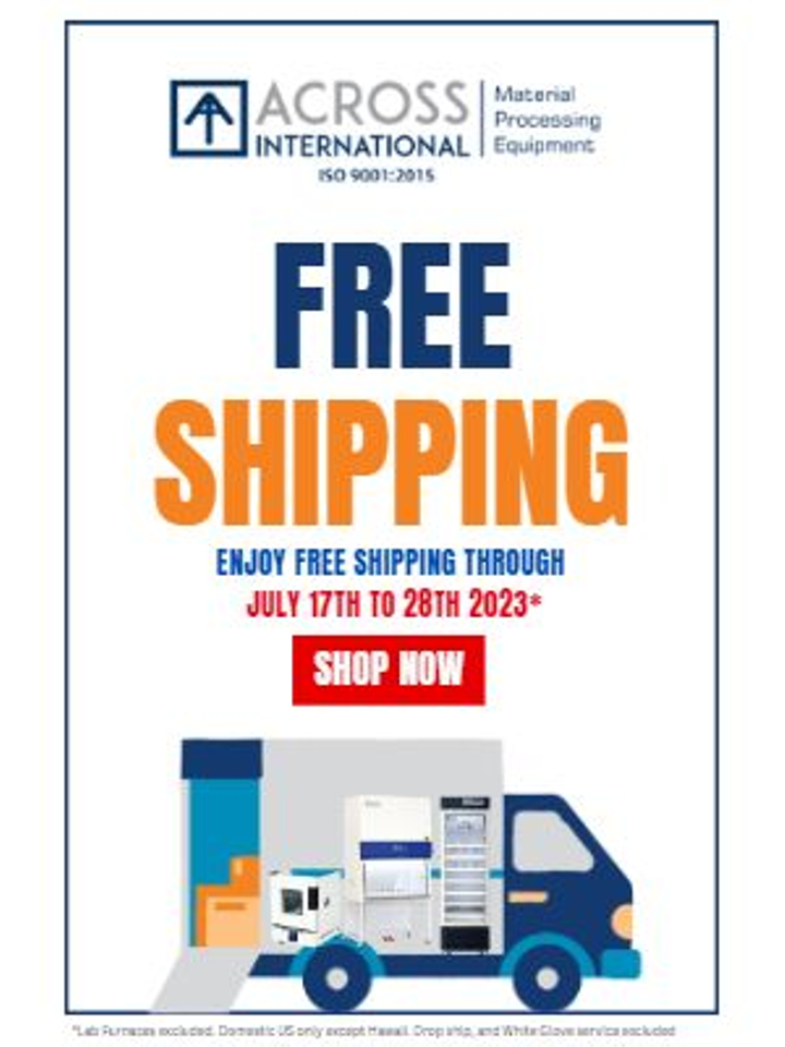 As an award-winning, ISO9001:2015 certified lab equipment supplier and manufacturer, Across International is well-equipped to serve your needs. In addition to standing apart as an exceptional manufacturer of laboratory freezers, refrigerators, biosafety cabinets, Lab furnaces, Scientific Ovens, distillation equipment, reactors, and more, we partner with the top brands in the industry to offer their products and integrate their components into our solutions designed in-house. Our expertise covers a wide range of sectors, from medical, pharmaceutical and research laboratories, to 3D printing, nanotechnology, materials research, food and beverage. Our customer base includes Fortune 500 companies, universities, government research teams and small businesses around the world. Limited Time Offer Take advantage of our limited-time offer for FREE shipping on most Across International lab equipment! At Across International, we believe that high-quality lab equipment should be accessible to everyone. Don't miss out on this incredible chance to get your hands on top-notch lab equipment with free shipping! Simply browse through our extensive range of lab equipment and take advantage of this enticing offer while it lasts. Don't wait any longer – make the most of our limited-time offer today! Through July 17th to 28th 2023. Hurry up to get the best deal for laboratory equipment with Across International!
