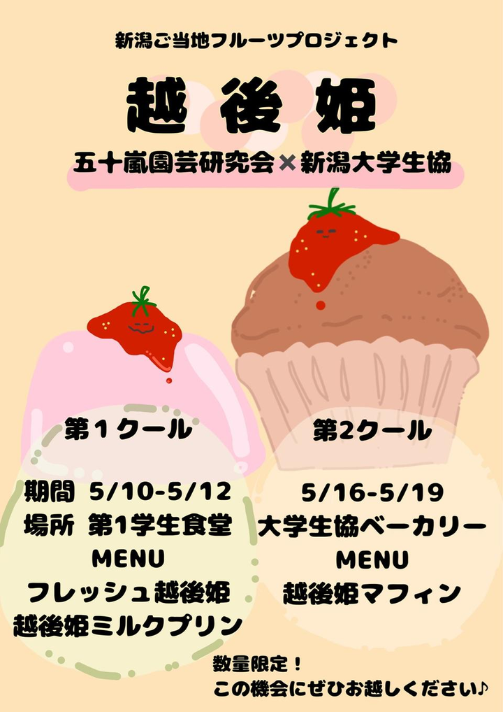 所属している五十嵐園芸研究会というサークルで果樹農家さんのお手伝いをしており、その際にハネモノ(傷などで商品にならないモノ)を毎回たくさんいただいていました。見た目が少し悪くても味は美味しい果物を活用するためにスイーツに加工するようになりました。地元の美味しい果物とハネモノの存在を知ってもらうために大学の学食で提供する企画を継続して行っています。レシピ考案から原価計算、実際の調理までをサークル員で行っており私は企画の主要メンバーとして、生協の方とのやり取りやシフト作成等も行っています。毎回好評をいただいており、季節ごとに様々な果物でシリーズ企画として開催しています。
