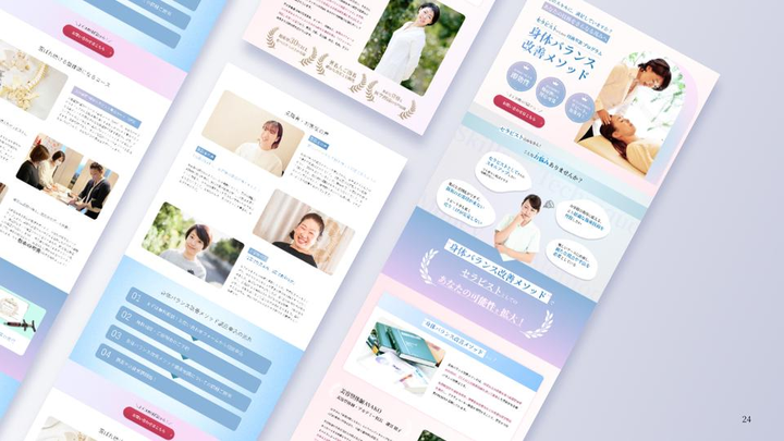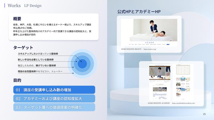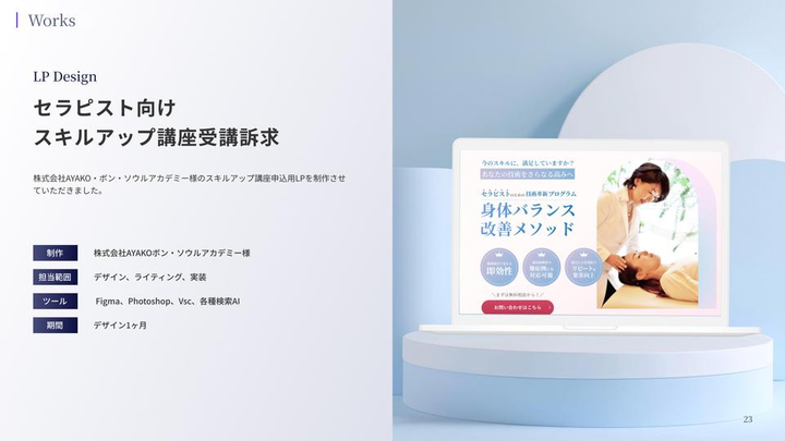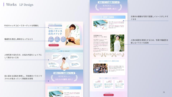 【Webデザイン】 ・LP/Webサイトのデザイン ヒアリングからクライアント様の課題とニーズを明確にし、課題解決のためのデザイン提案をさせていただくよう心掛けております。