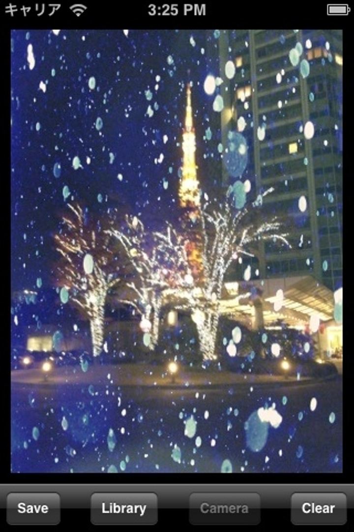 自作iPhoneアプリを使って粉雪の画像と東京タワーの写真を合成しました。