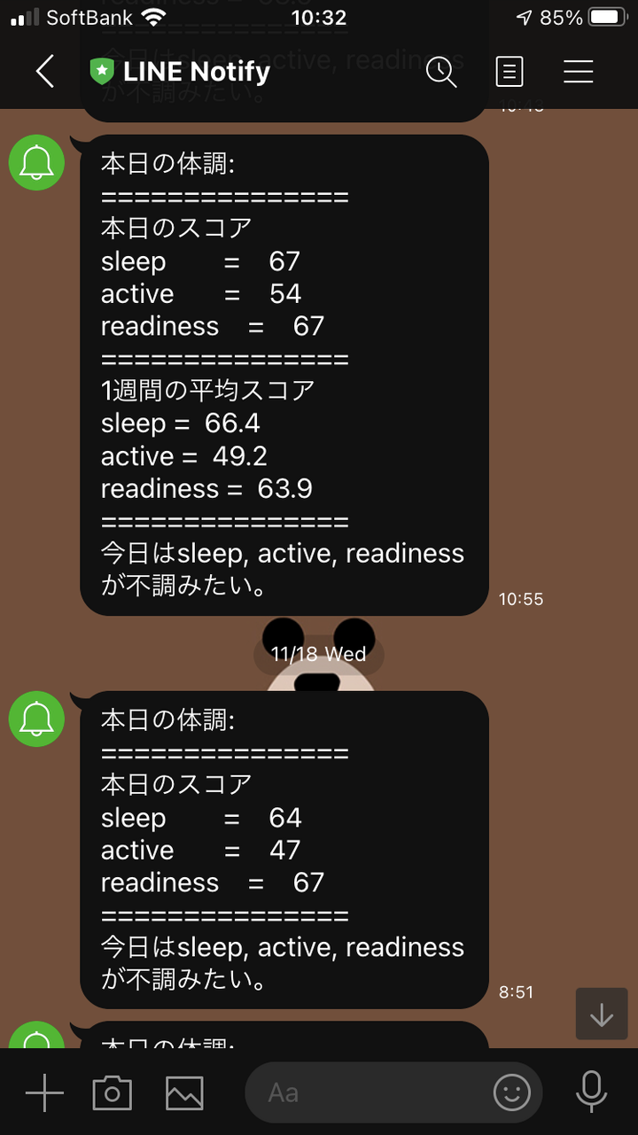 プログラムの概要 Oura ringの本日のデータ、1週間分のデータの平均値を取得し、取得したスコアをLINEで通知する。 作成の動機 Oura ringは自分の睡眠状態や健康状態を数値化してくれる便利なものだが、各日付毎のスコアしか分からない上にアプリを開かないとスコアが確認できないのが面倒。。 そこでスコアをLINEに送信することによって、LINEで本日のスコアや1週間分の平均スコアを確認したいと思い作成しました。 事前準備