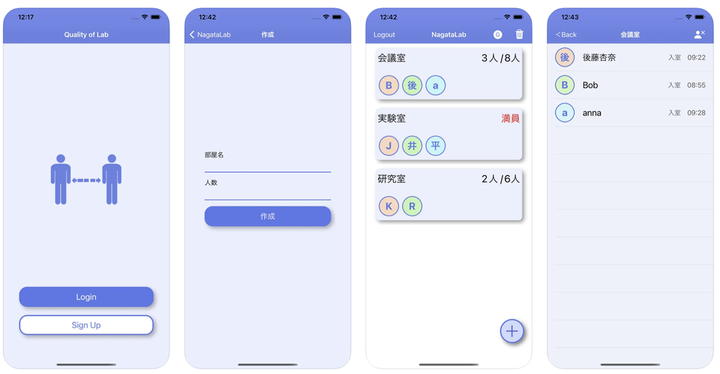 Xcode・FirebaseでのiOSアプリ開発 【制作期間】 1ヶ月 【ジャンル】 勤怠アプリ 【メインターゲット】 研究室のメンバー 【アプリ内容】 〜部屋の利用人数を制限、管理できるアプリ〜 どこにいてもリアルタイムで部屋を利用している人数、メンバーを把握することができる 【使い方】 <メイン機能> ①ホーム右下の+ボタンから,部屋名と定員人数を入力・作成 ②作成された部屋をタップし、入室/退室ボタンを押す ユーザ名と入室時刻が表示される ③ホーム画面に部屋に入室しているメンバーのアイコンと利用人数が表示される <オプション機能> 〜学生の研究へのモチベーションに繋げる〜 ・退出ボタンを押すとお疲れ様のメッセージを表示 表示内容:「お疲れ様!!ゆっくり休んで,良い夢みてね〜!」 ・入室してから8時間を超えると休憩を取るように促す通知機能 通知内容:「滞在時間が8時間を超えたよ!過労に注意!しっかり休憩を取ってね!!」 App Sotreにリリース↓ https://apps.apple.com/jp/app/quality-of-lab/id1558471758