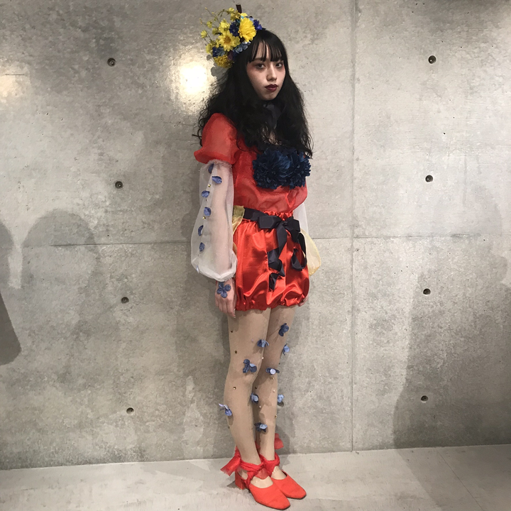 私の作品はゴッホの「The Starry Night / 星月夜」を着想源にして、この絵の背景に「ゴッホが精神病院に入院中に病室から見えた景色を描いた作品」ってとこからスマホの色彩反転機能を使って絵の色を反転させて、そこからイメージしたデザインです。 初めて学校の課題以外で自分で作って、学校は既製服をつくるための綺麗な仕上がりを目指した服だけど、FDLは売るための服ではないので個人個人が好きなように制作して表現するので作図もせず使ったこともない生地で自分以外の人が着るための魅せるための服を作って色んなことを発見できました。