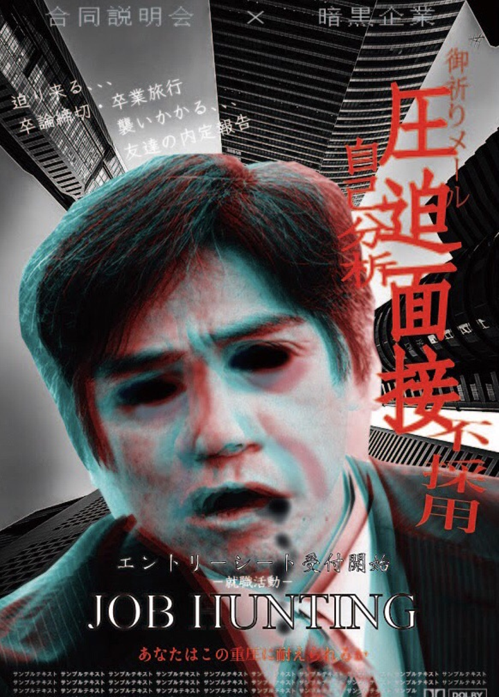 専門学校でホラー映画のポスターを作りましょうと課題を出された時の作品です。 ホラー映画をあまり観ない私なりに考えて、ホラー、怖い、「就活」という事で、就活をホラー風に表現した作品です。