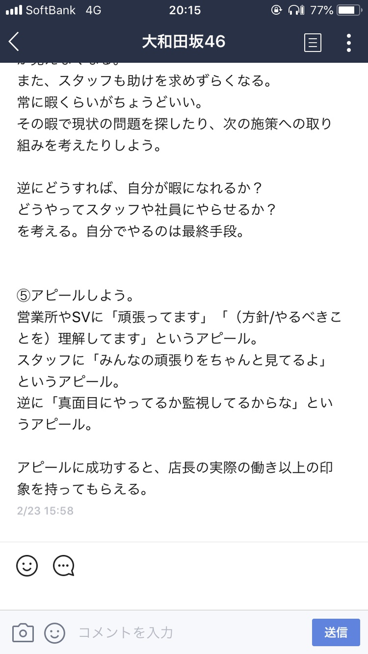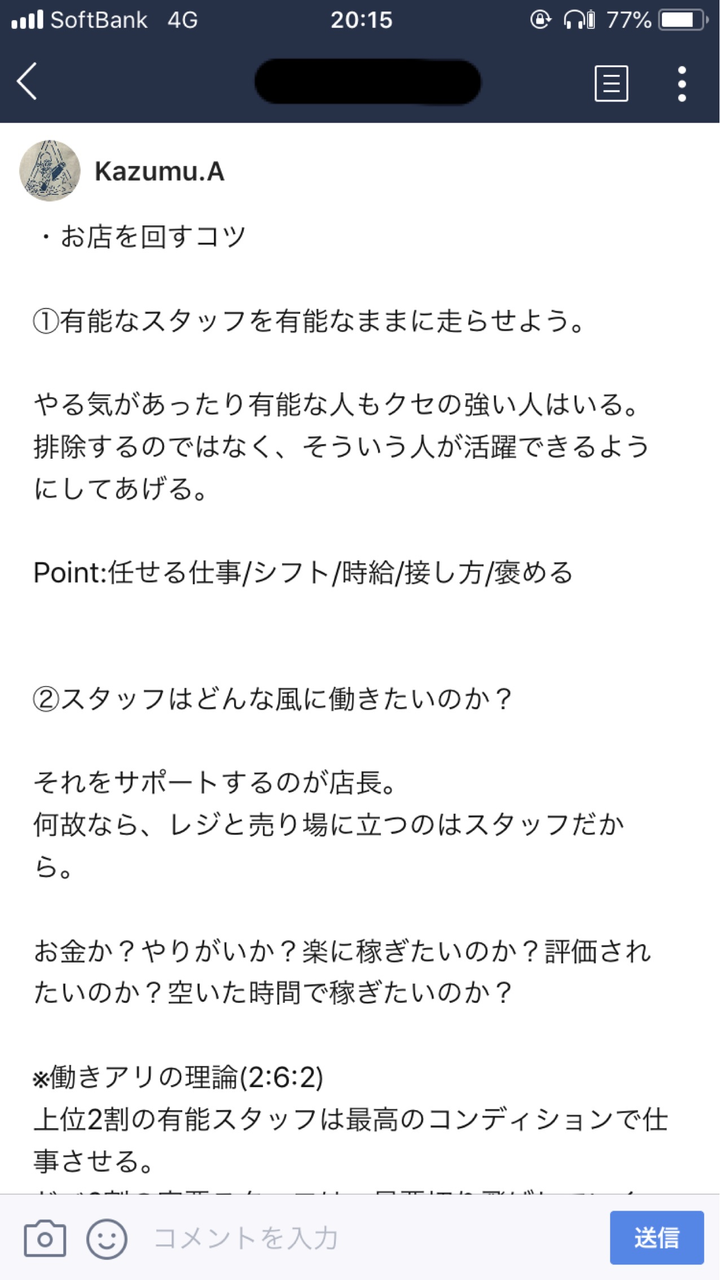 メンティと共に自主的に月一で勉強会も行いました。 用意するレジュメはLINEのノートで配信。 この回のテーマは『店舗運営のコツ』。 自身の経験や大切にしている事を教え、メンティーが店長となった時を全員で想像し対話形式でミーティングを行いました。