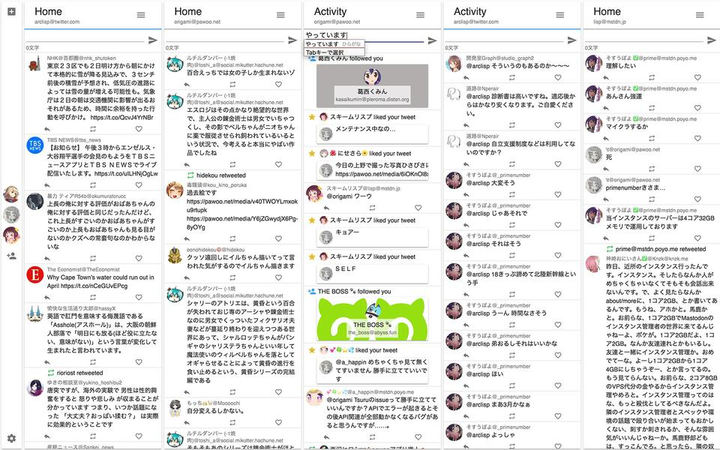 Twitter/Mastodon/GNU SocialをTweetdeck風に管理できるクライアント制作をしていました。当時はTwitter代替サービスとしてMastodonやGNU Socialなどが流行しており、それらをまとめて管理できればと思って作ったものです。 技術スタックはJS+Reactのみです。ブラウザ上で動くことを前提に作られていました。 Tweetdeckでは起きやすいアカウント間の誤投稿を防ぐため、Tweetdeckの左ペインをごっそり削除したデザインにしました。 ちょうどTwitterがStreaming APIを終了させる前に作ったもので、現在では稼働しておりません。理由としてはTwitterのAPI提供の大幅な方針転換、自分がTwitter Webのみを使うようになったこと、MastodonやGNU Socialを一切使わなくなったため個人として必要がなくなったためです。