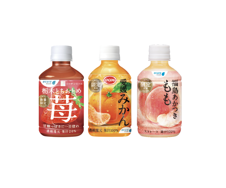 JR駅構内の自販機で販売されているオリジナル飲料 限定発売の果汁飲料のラベルデザイン。