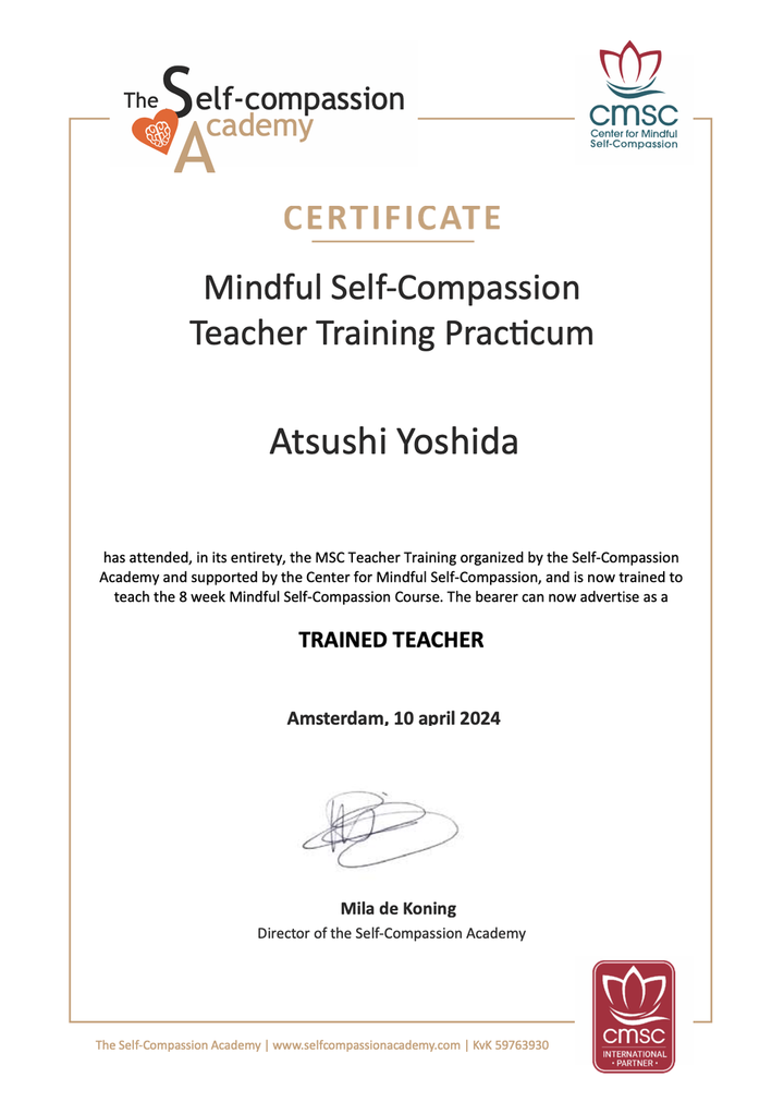 マインドフル・セルフ・コンパッション(MSC)講師養成講座を修了。①2023年6月にオランダで1週間合宿、②2023年9月よりオンラインでの3ヶ月の研修、③2023年2月よりHelle Laursen氏のスーパーバイズを受けながら2ヶ月間講座開催。