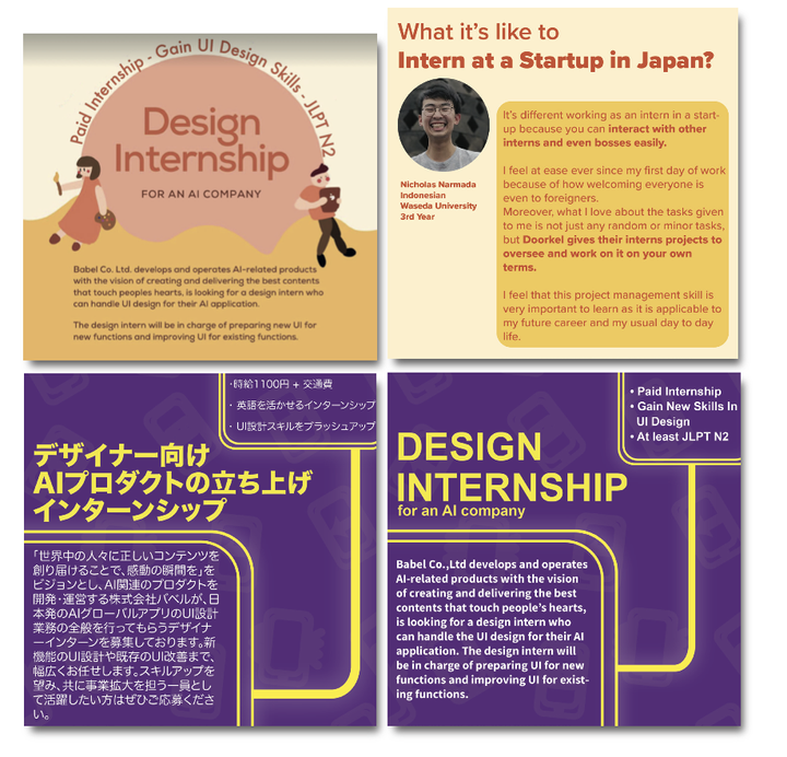 •企業のウェビナー、インスタ、Linkedin、Tiktokなど様々なソーシャルメディアコンテンツを デザイン。 •ポスターの作成、コピーライティング、学生団体への投稿により、各ウェビナーで50名以上の 参加者を得ることができた。
