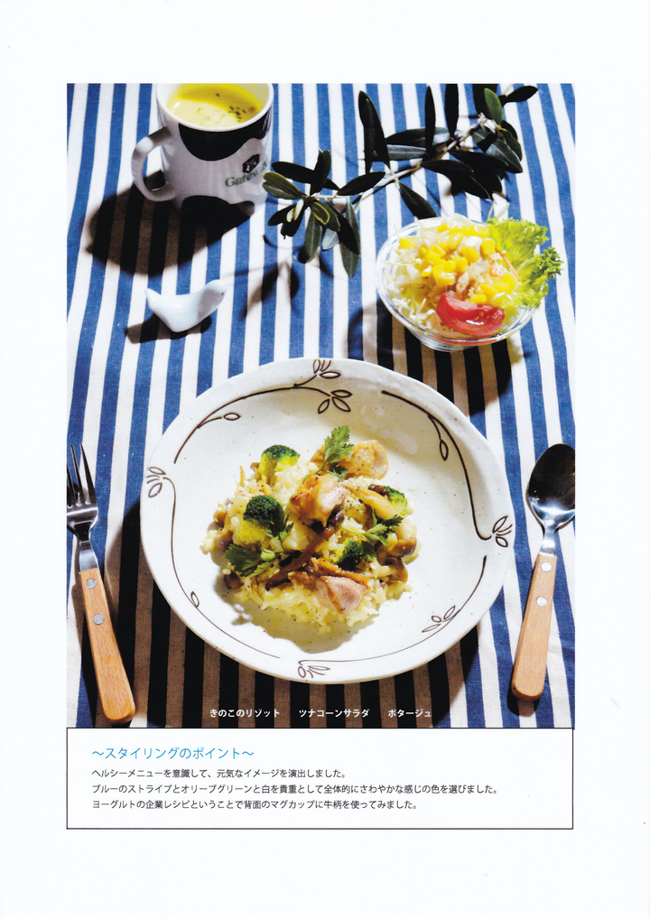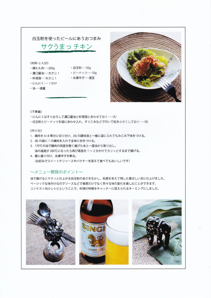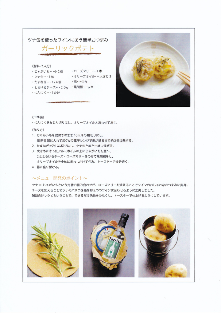 ・白玉粉を素材としたレシピコンテストを想定したレシピ 「サクうまっチキン」 ・雑誌媒体を想定したワインに合う簡単なおつまみレシピ 「ガーリックポテト」 ・ヨーグルトメーカーをクライアントと想定した企業向けレシピ 「きのこのリゾット」