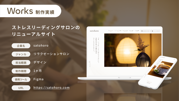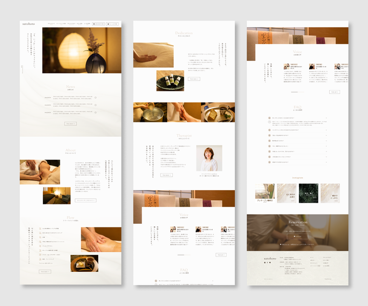■概要 ストレスケアサロン様のリニューアルサイト。 ■ターゲット 周りの目を気にしたり、不安が先行して自分を後回しにされている女性。 ■顧客の課題 公式ライン登録前に、お客様が安心して情報収集できるサイトが欲しい。癒しやトリートメントの魅力がしっかり伝わる構成を重視したい。 ■制作期間 1ヶ月 ■使用ツール Figma ■担当範囲 Webデザイン ■制作の意図 素敵な写真の世界観が伝わるよう、写真をメインにし、余白を広めにとることで、洗練された上品なデザインにしております。 サロン様の内装は茶色をベースとした、和がテーマの、リラックスできる空間。 テーマに沿ったデザインとして、トリートメントの気持ちよさが伝わるような波線の背景を使用。 内装に使用されていた和紙の質感も取り入れています。 また、アニメーションもスクロールするごとにふわっと情報や写真が登場し、トリートメントをされているような、癒されるサイトにしました。