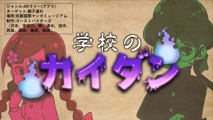 大学3年生の後期にチームで製作したAR型探索ゲームです。 私はUI、ロゴ、イベントスペースの装飾を担当しました。 2月にゲームで遊べるイベントを、京都国際マンガミュージアム様で開催しました。