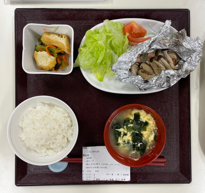 糖尿病食を作りました。 献立は、 ご飯 卵スープ 鮭とキノコのホイル焼き 付け合せ(レタス、トマト) 小松菜と油揚げの炒め煮 です。 糖尿病食は塩分を抑える必要があるので、キノコのうま味を利用したり、ローリエを使って香り付けをしました。そうする事で塩分量は少なくても、食材の味や香りによって食べた時の満足感があります。 また、食物繊維の豊富なキノコ類や海藻類を使用することで、歯応えがあり、満腹感のある献立にしました。