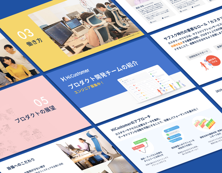 担当: スライドデザイン、イラスト、写真撮影・レタッチ チーム内外のメンバーが気軽にレビューできる仕組み作り Notionを使って構成とワーディング、Figmaでスライドデザインを作成。進捗をSlackの全体チャンネルで社内に報告し、非同期で気軽にレビューできる仕組みを作りました。エンジニアだけでなく、営業やカスタマーサクセスも巻き込むことで、プロダクト紹介部分の言葉を研ぎ澄ませることができました。