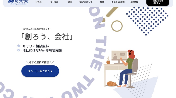 Be motion様よりご依頼 ITエンジニア系企業のLP制作を承りました。 文字の円が回っていたり、スケジュール表を人々が見ているようなあしらいを工夫しました。