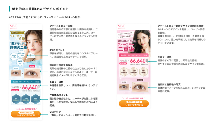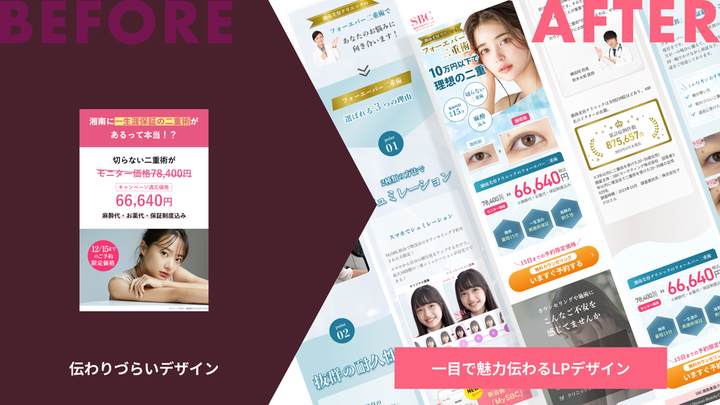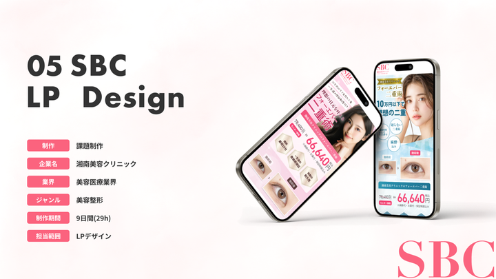 制作:課題制作 企業名:湘南美容クリニック 業界:美容医療業界 ジャンル:美容整形 制作期間:9日間(29h) 担当範囲:LPデザイン