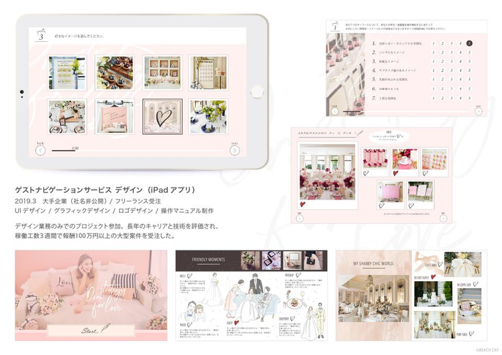 ブライダル業界でのゲストナビゲーションサービスのUI・グラフィックデザインを担当。 女性がワクワクしてくれるようなビジュアルと世界観を提案しました。