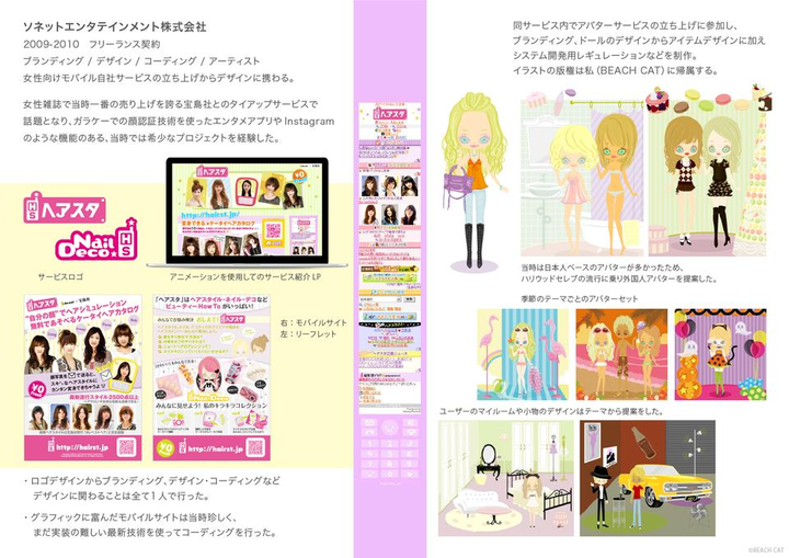 ・ブランディングやロゴ制作、印刷物、モバイルおよびPCサイトのグラフィック・UI/UXデザインからコーディング、社外エンジニアチームとの連携まで幅広く担当しました。 ・当時のモバイルサービスサイトにはなかった、ラインストーンやグラフィックを多く入れた表現は、ターゲット層にインパクトを与え、社内外より高く評価されました。また、ファイルサイズを小さくする工夫など細かい配慮には定評がありました。 ・同サービスのアバタープロジェクトのドール作者に抜擢され、アーティストとして自身のタッチで世界観を描きました。 この時契約期間満了となったものの、他社とのコンペに全員一致での票を獲得したことから、特例で同社とフリーランス契約を結び、イラストやデザインを提供しました。