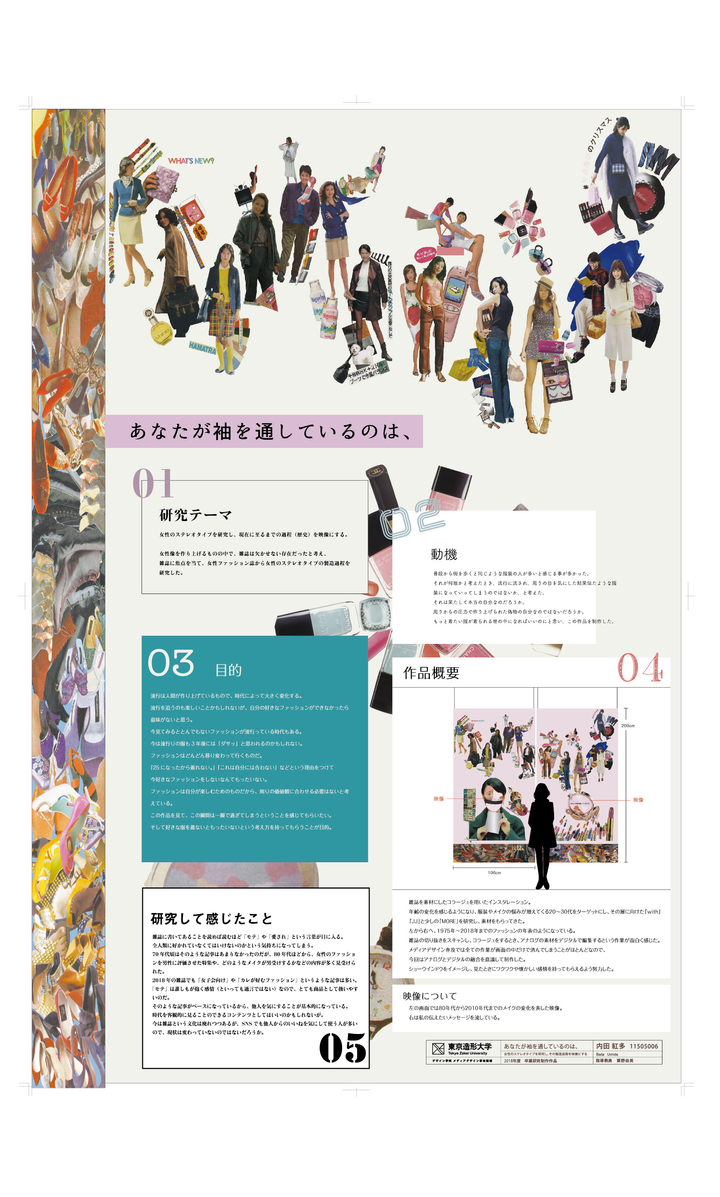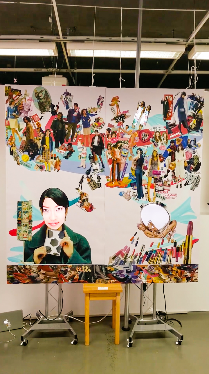 雑誌を素材にしたコラージュを用いたインスタレーション。 普段から周りの意見や流行が原因で、ファッションが制限されていると感じていて、 実際に周りの人間が「20代でミニスカートはきついよね」「この髪型は今しかできない」など守って何が得なのかわからない他人を気にした価値観で、自分の好きなファッションを楽しめていない現状があった。 この価値観を作り上げたものの中で、雑誌は欠かせない存在だったと考え、女性ファッション誌から女性のステレオタイプを研究し、その雑誌から素材をもらい、印刷物と映像を制作した。 この作品を見て、ファッションを見直して自分の好きな服と向き合ってみてほしい。 もっと着たい服が着られる世の中になりますように。