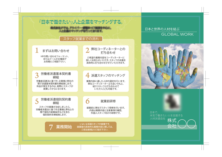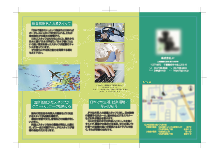 人材派遣会社の会社案内/A4Z折り両面4C グローバル感と親しみやすさを意識。 デザインだけでなく、掲載テキストを作成し地図も制作、印刷会社への手配も担当した。