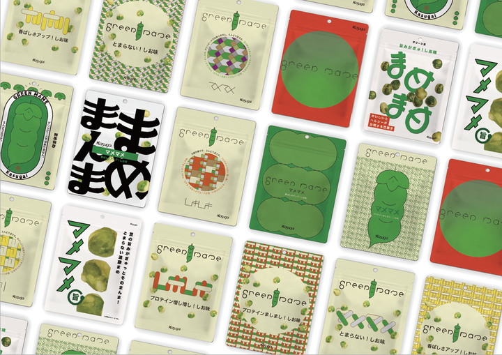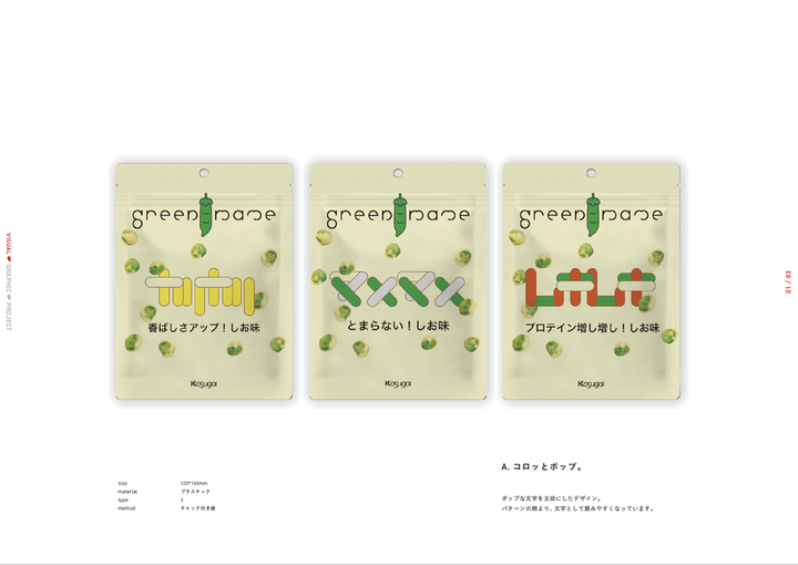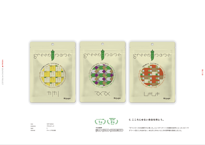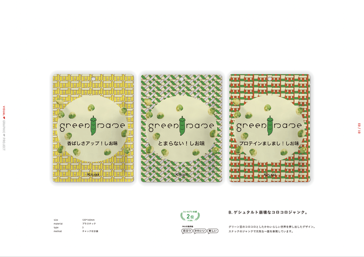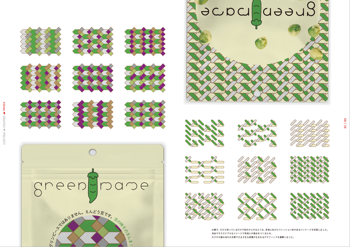春日井製菓株式会社さまと連携して、豆菓子商品「グリーン豆」の リニューアルパッケージを考案・制作しました。 若年層に向けたパッケージという要望から、 春日井製菓の長い歴史の良さを残しつつ、 革新的なデザインを目指しました。 --- デザインは個人で制作し、春日井製菓さまと話し合いを重ねることで7案までしぼりこみ、 15歳–24歳男女500人にWEB調査をとり、実際に市場に出るものを決定させました。 残念ながら私のデザインは選ばれなかったものの、 調査の結果、作成した2案が「価格提示後の購入意向」や「コンセプト共感」の点で高く選ばれ、評価されました。 この取り組みでは、 お菓子だけど、持っているだけで気分が上がる、若者に向けたファッション性のあるパッケージを目指しました。 カタチの組み合わせ次第でさまざまな表情が生まれる、自由でサステナブルなイメージで若者との接点をつくろうと試みました。