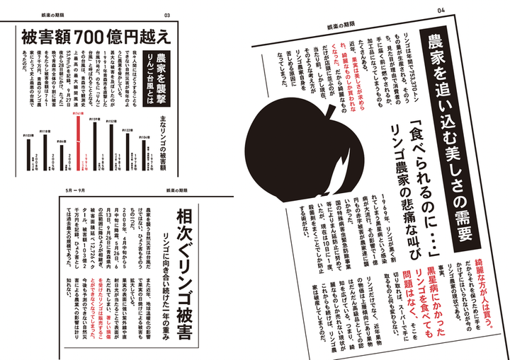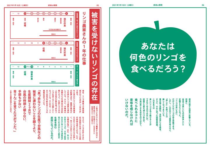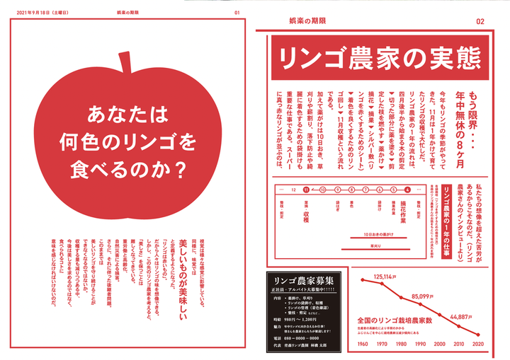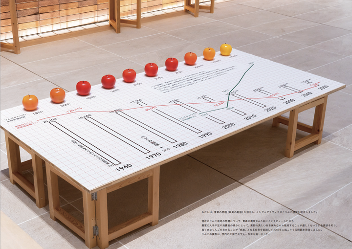 食糧難に陥る未来を見据えてこれから直面する未来について発信し、 「私たち」がどう行動すべきか、考えるきっかけをつくる展示を行いました。 わたしは、青果の問題(娯楽の期限)を担当し、インフォグラフィクスとりんご模型を制作しました。 現在のりんご栽培の問題について、青森の農家さん5名にインタビューしたのち 農家の人手不足や消費者の減少によって、果物の美しい色を保ちながら栽培することが厳しくなっている現状を知り、 真っ赤なりんごを求めることが「娯楽」となる将来を仮説して2050年に起こりうる問題を発信しました。 ーーー >もっと知りたい方へ りんごの模型は、学内の工房でスプレー加工を施しました。 りんごは、わたしの好きな果物ランキング2位です。