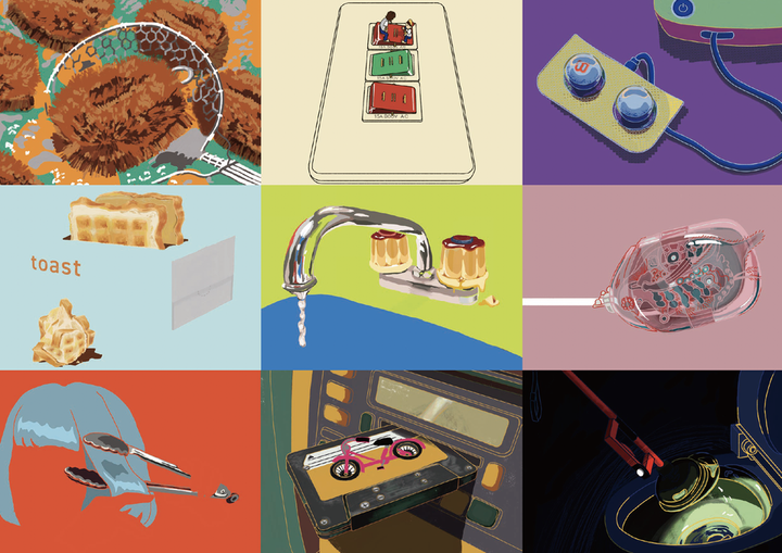 1枚目:似顔絵 ゼミの友人とお世話になった先生全27 人のイラスト。 卒業時に、サプライズでプレゼントしました。 描いたものをAdobe Illustrator でパスにおこし、 調整して制作しています。 似顔絵は日常的に描いています。 2枚目:アマビエ 「歯を絡めた、新型コロナウィルス感染防止ポスター」という 島根県歯科医師会の会員の依頼のもと制作させていただきました。 描き写すことで疫病の流行を防ぐといわれたアマビエが方言を交えて ゆる~く歯磨きの大切さを伝えています。 3枚目:みたてる 生活を別のもので置き換えてみることで、 見慣れた毎日もおもしろおかしく映り、リズムに変化と豊かさをもたらすことを 実験的に展開したイラストです。