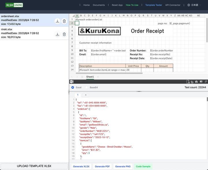 xlsx template と json データで文書を作る api と動作確認用の web clinet を構築。 https://xlsx-template.kurukona.net/ https://xlsx-template.kurukona.net/docs/ https://xlsx-template.kurukona.net/developer/ https://rapidapi.com/kurukona/api/xlsx-template