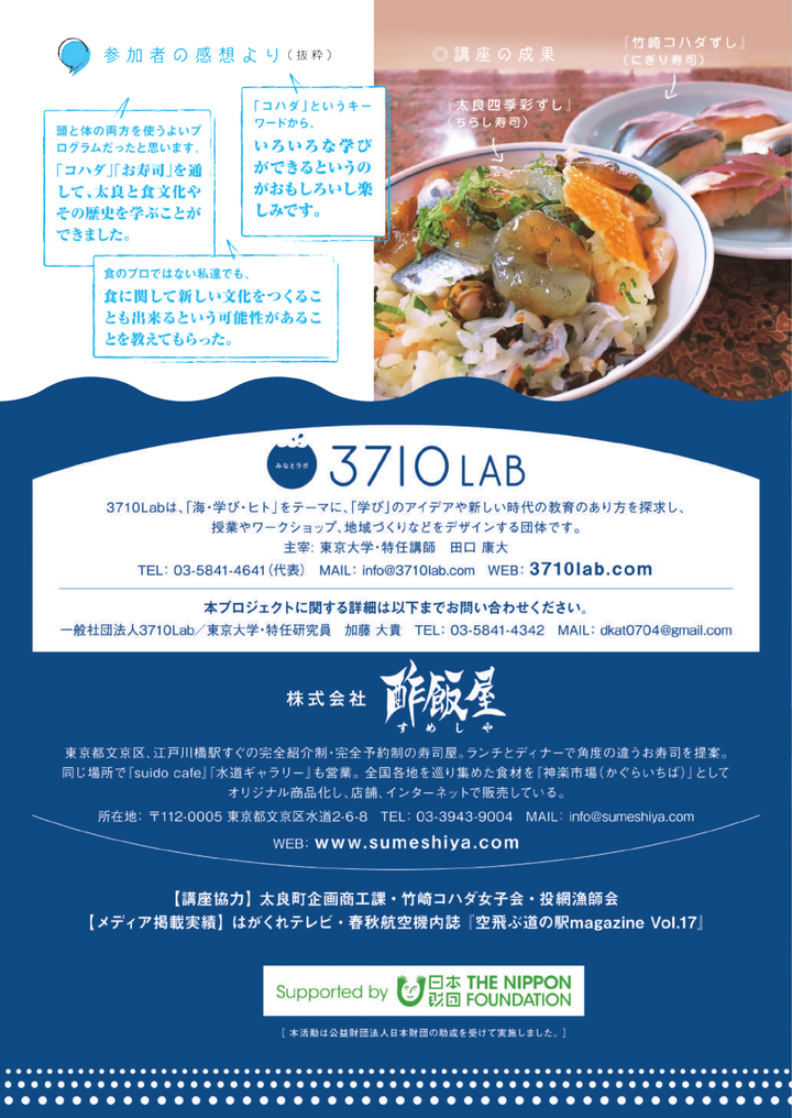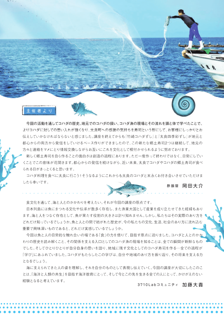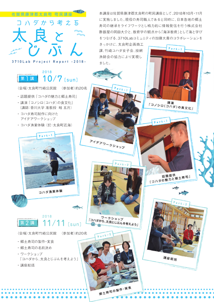 2018年に佐賀県藤津郡太良町にて実施した町民向け講座の報告書。 コハダ活用の歴史、漁業体験、新しい郷土寿司の製作を通して、自分や地域の将来への思いに気づき表現していく全2講の講座。 共同主催:株式会社酢飯屋 代表取締役 岡田大介氏 講座協力:太良町企画商工課・竹崎コハダ女子会・投網漁師会 メディア掲載:はがくれテレビ・春秋航空機機内誌「空飛ぶ道の駅magazine Vol.17」 ※一般社団法人3710Labメンバーとして、公益財団法人日本財団の助成を受け実施。 https://www.sumeshiya.com/blog/2018/12/post-3893.html