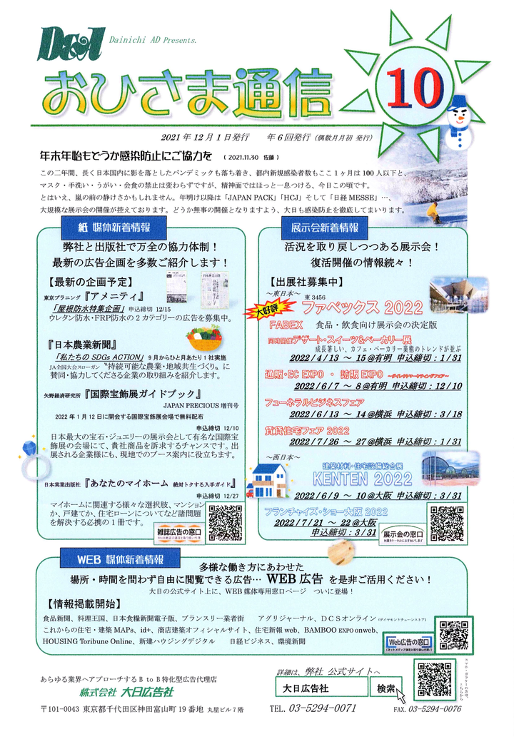 コロナ禍が長引く中で、希薄になりつつあった既存顧客とのコミュニケーションツールとして社外広報紙「おひさま通信」を企画・作成。 日々、クライアントの新しい広告展開の検討に役立ててもらっている。