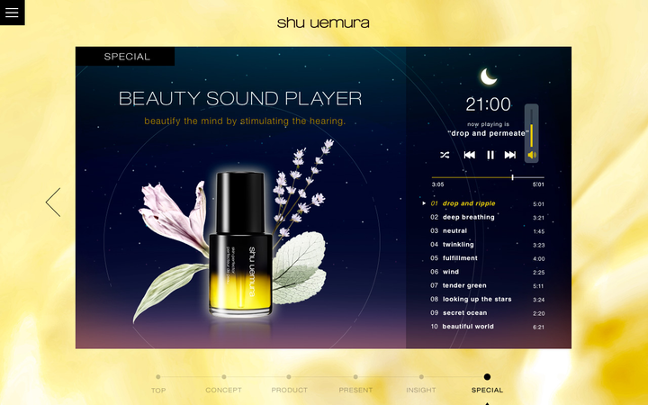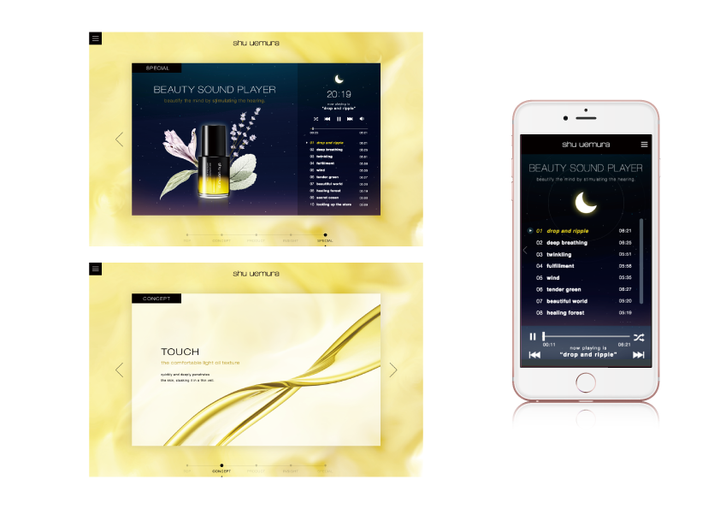 コスメブランド shu uemura のプロダクト”skin perfector”のグローバルサイト。 オイルという性質の商品であるため、その質感を全面に出しつつ、 サイト上では音も合わせて五感で商品を楽しめるというコンセプトで作成しています。 サウンドプレイヤーからなるサウンドはとても上質でいつまでも聞いていられるものになっています。