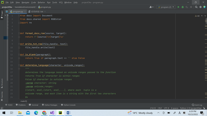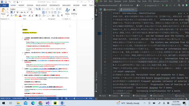 翻訳氏を志す友人のためにdocxファイルをタッブデリミテッド形式のtxtファイルに変換するPython3プログラムを作成。彼が作成した翻訳文章をパーシングし、翻訳ソフトウェアに取り込みやすくさせるためにプログラムを作った。