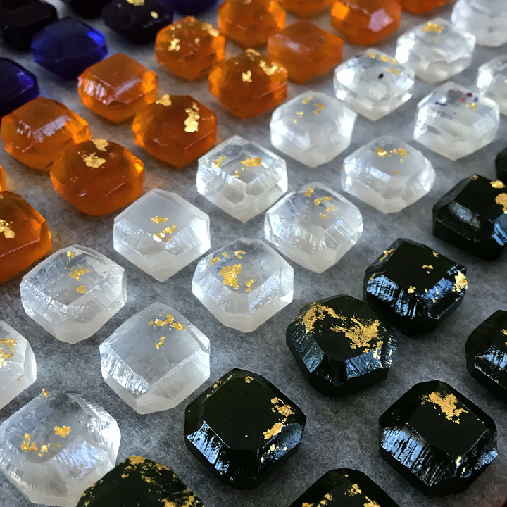 無添加、無着色の琥珀糖です。食品だけで味と色をつけています。奥から、アールグレイ、ローズ、抹茶フレーバーです。