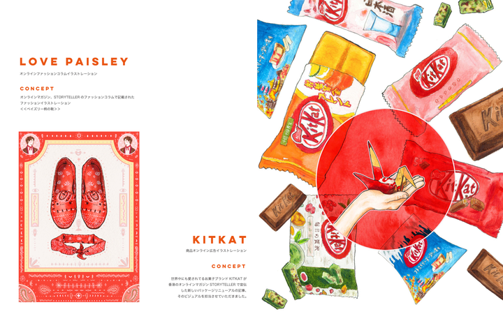 商品オンライン広告イラストレーション 世界中にも愛されてるお菓子ブランドKITKATが 香港のオンラインマガジンSTORYTELLERで宣伝した新しいパッケージリニューアルの記事、 そのビジュアルを担当させていただきました。