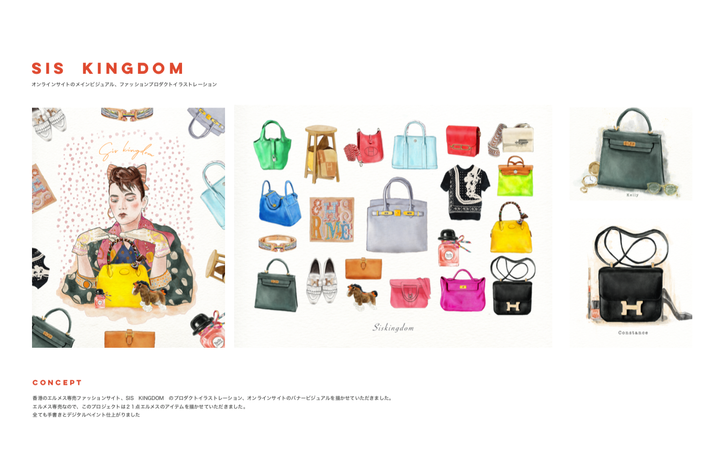 オンラインサイトのメインビジュアル、ファッションプロダクトイラストレーション 香港のエルメス専売ファッションサイト、SIS KINGDOM のプロダクトイラストレーション、オンラインサイトのバナービジュアルを描かせていただきました。 エルメス専売なので、このプロジェクトは21点エルメスのアイテムを描かせていただきました。 全ても手書きとデジタルペイント仕上がりました