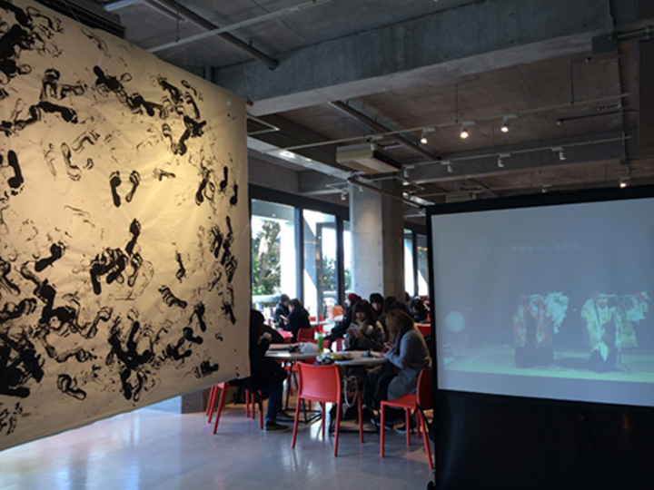 学科内の1年生とAゼミに所属する3年生が合同展示会に出品しました。 「ring」をテーマに、自分の身の回りのringを考えた時、今までで一番関わりが深かった石見神楽を作品に昇華したいと考え制作しました。映像では演目「塩祓い」を上映し、その足跡を視覚化することでringを表現しました。