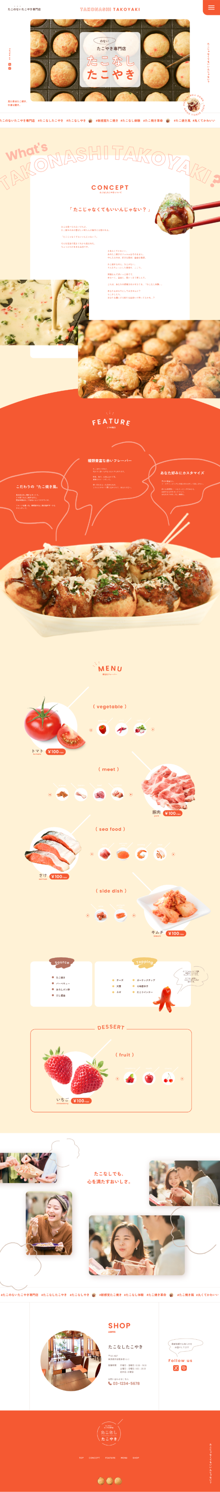 ターゲット: 女性 / 10−30代 /カップル /ファミリー 向け 【制作意図】 * ポップで食欲をそそる配色 * 明るい朱赤をメインに、黄みベージュと白を組み合わせて、たこ焼きのイメージと食欲増進を意識。かわいくスッキリした印象に。 * SNS映えと拡散狙い * キャッチーなハッシュタグやトレンド感のあるデザインで、若い女性のSNS拡散を促進。 * 視覚的に惹き混む工夫 * 大胆な商品の写真やシズル感のあるあしらいで食欲を刺激。 * 世界観の演出 * たこやきの丸型を全体に散りばめて活かし、デザイン全体で統一感を演出。 * 共感を引き出し親近感を感じてもらう工夫 * ユーモアやラフな口調を取り入れ、親近感と愛嬌を感じてもらう工夫を。食事シーンが想像できる写真と魅力的なメッセージを組み合わせ、共感を引き出すデザインに。