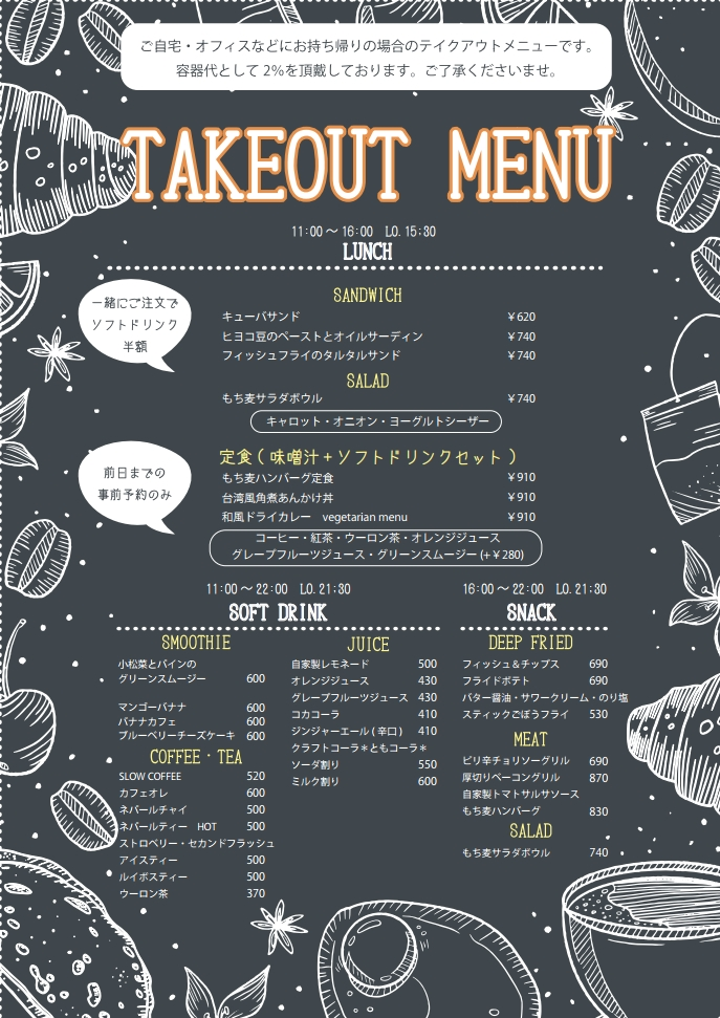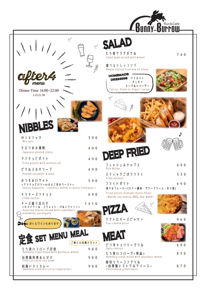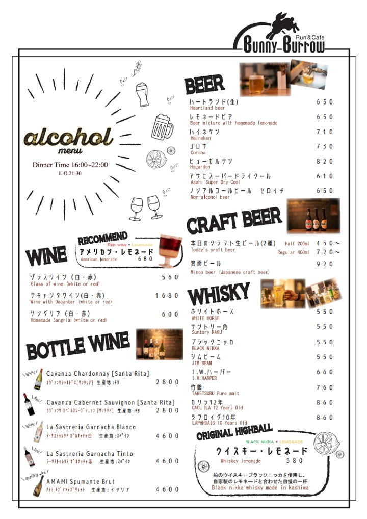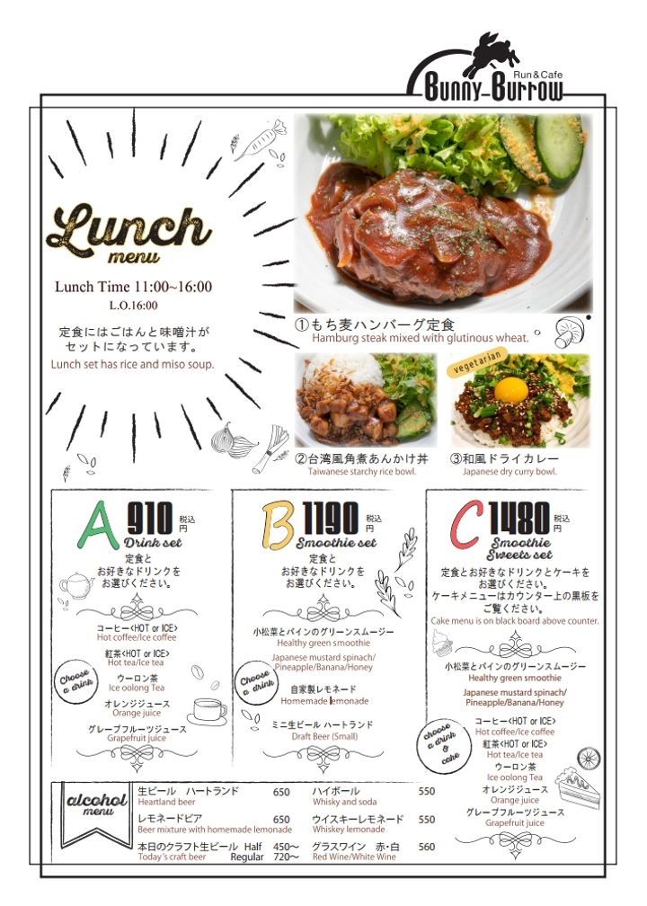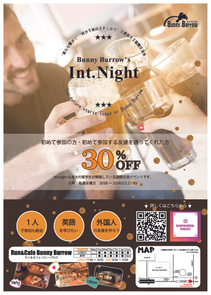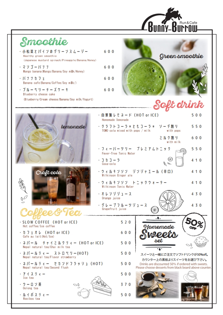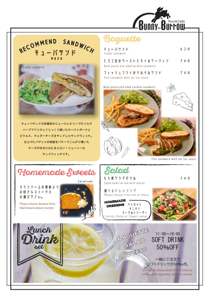 前職で勤務していたカフェのメニュー表をillustratorで作成しています。外国人のお客様が多かったため、英語表記と写真を多く入れて作りました。 外国人のお客様と合同で交流イベントを開催していたので、日本人に向けたチラシを作成し、配布していました。