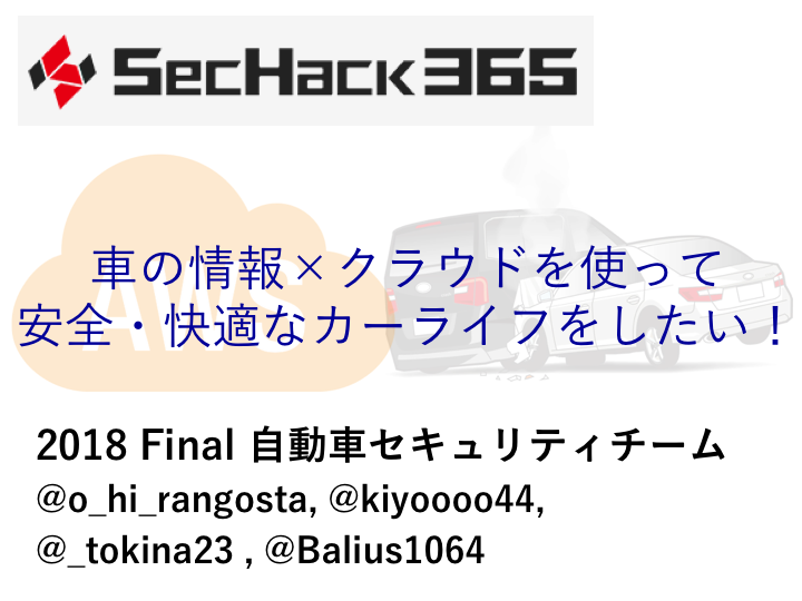 自動車に載せる車載器から、その情報を収集するクラウド部分、そのデータを可視化、評価する部分まで、4人のチームで作り上げました。 こちらはSecHack365の作品になります。 JAWS UGなどでお話しました。