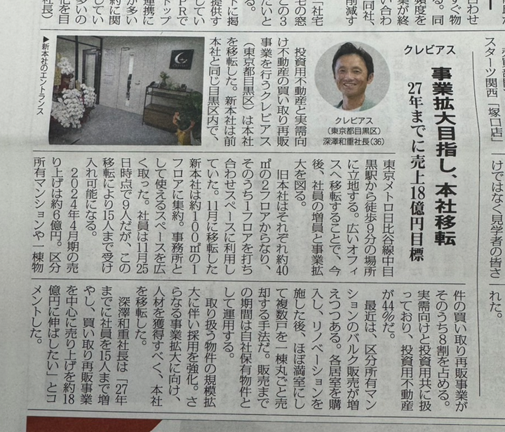 2024年に本社移転もあり全国賃貸住宅新聞に紹介していただきました。前期(8期目)の売上は約6億円、今期(9期目)は売上10億円を目標としています。